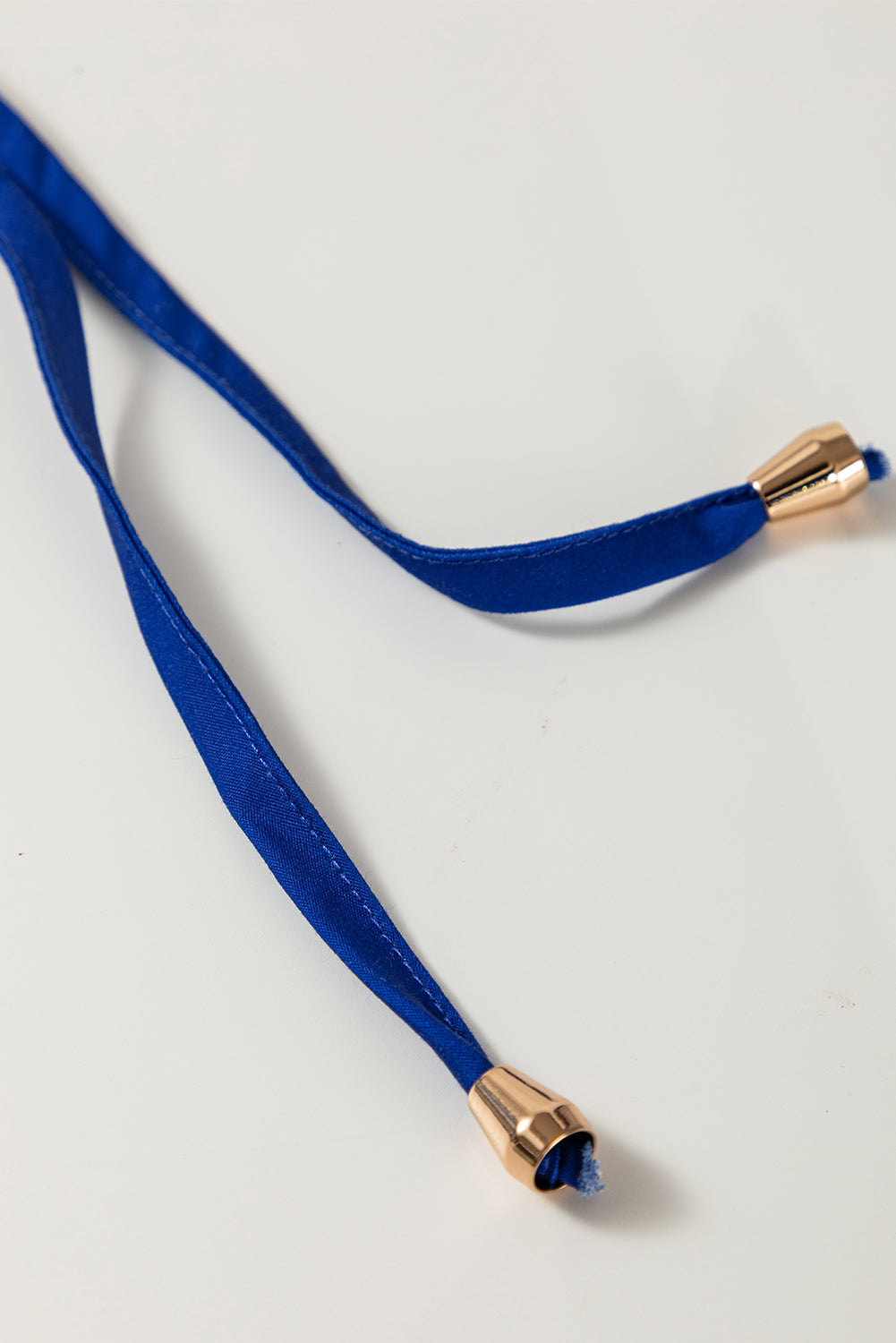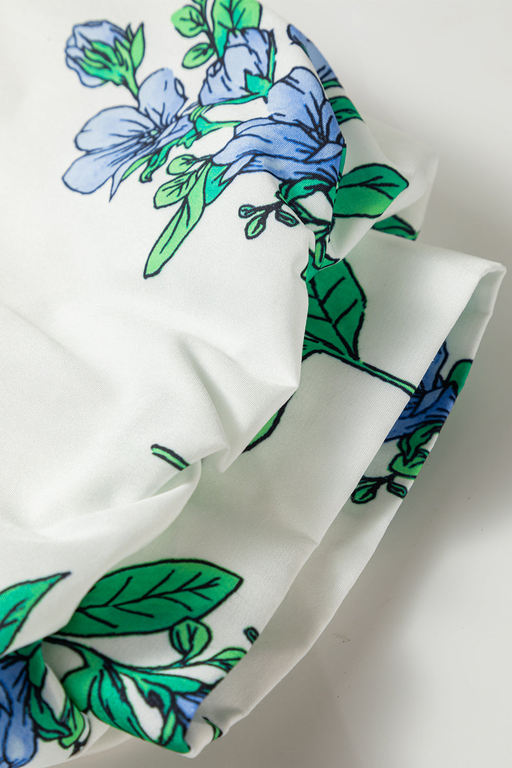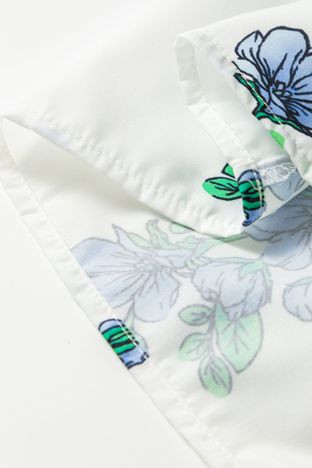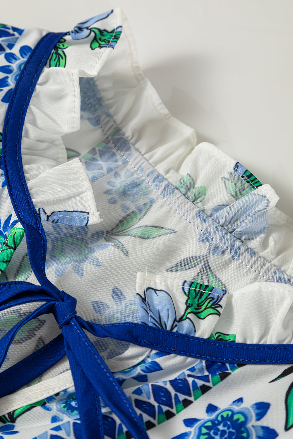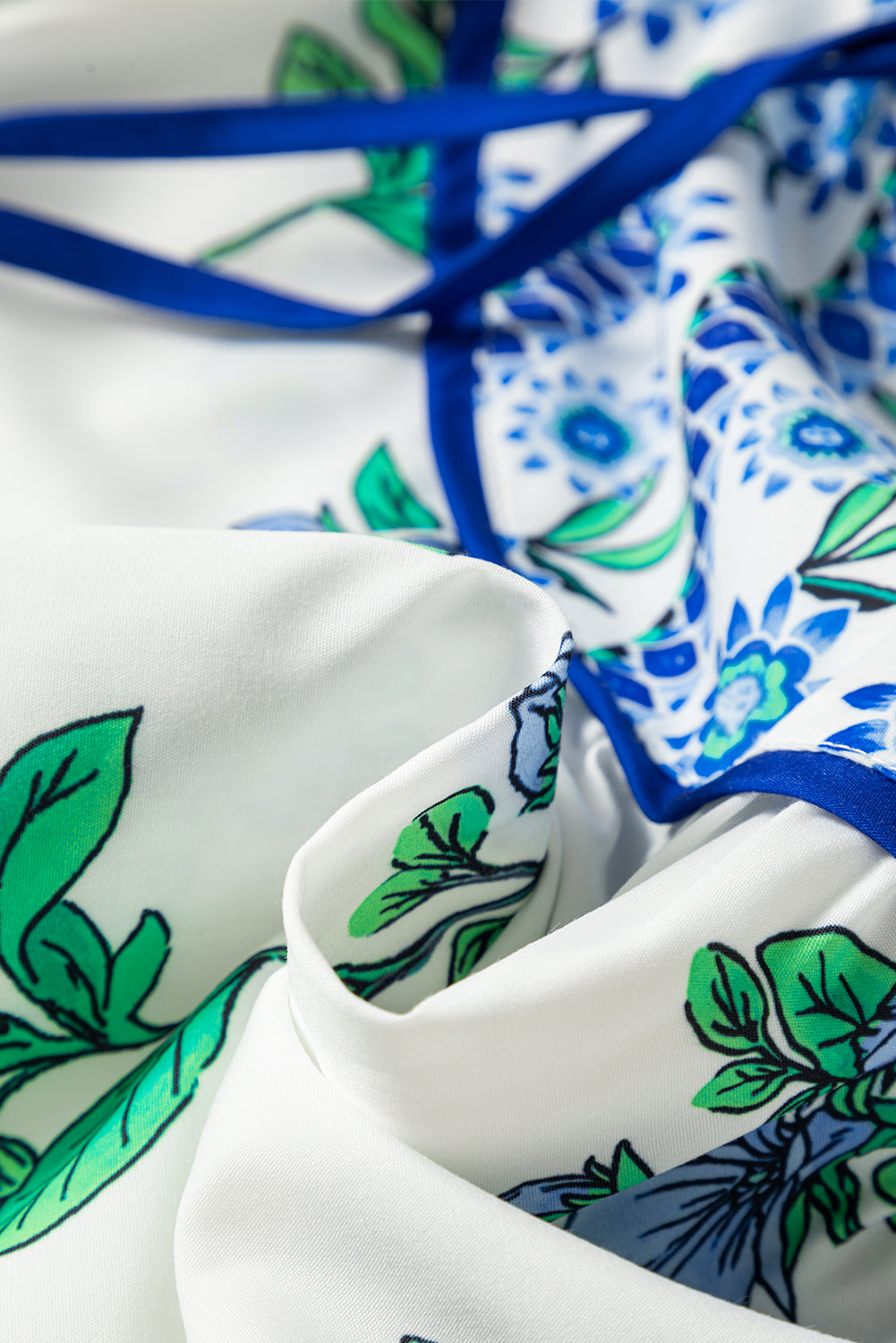 Beige Floral Print Piping Trim Tie Neck Short Sleeve Blouse