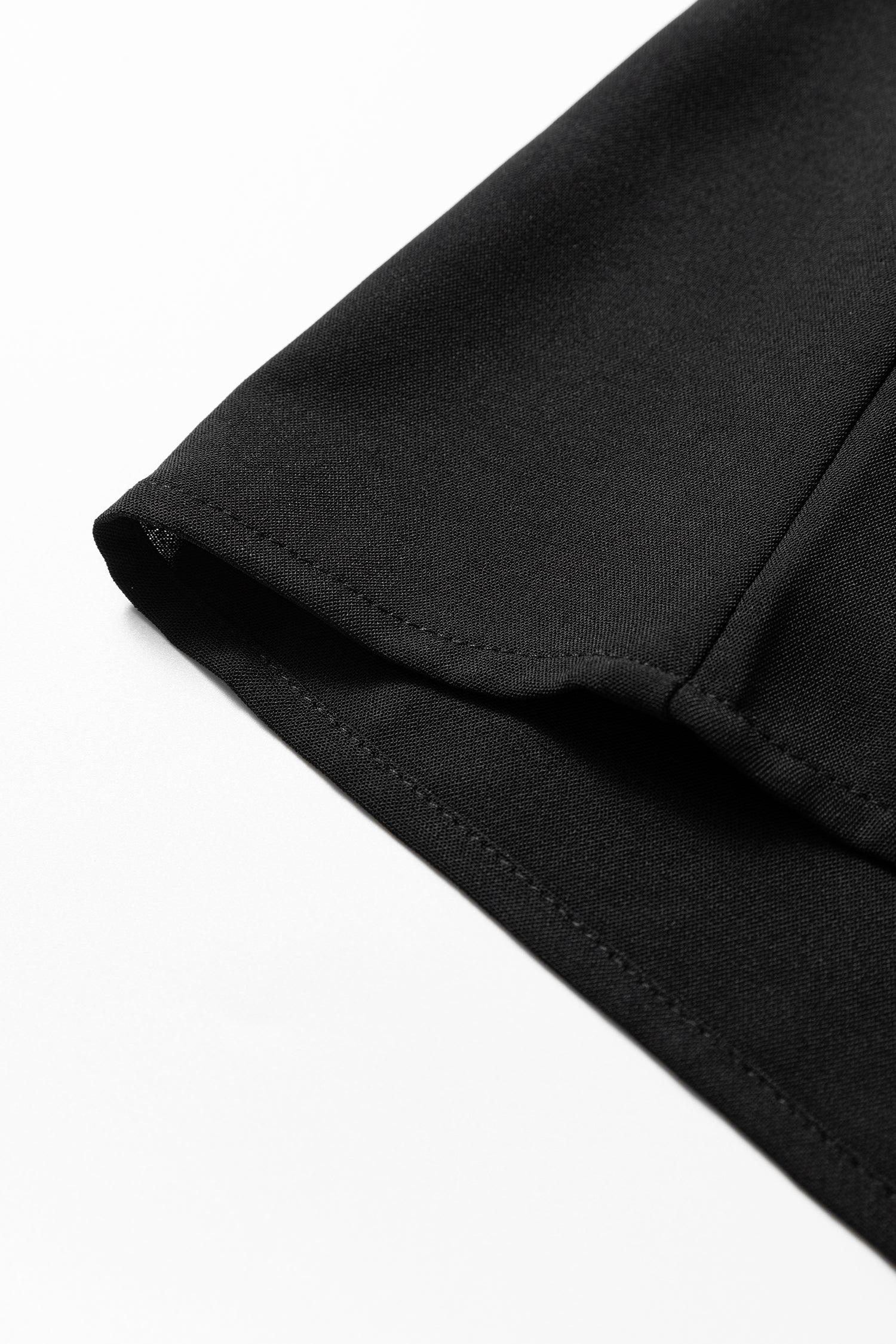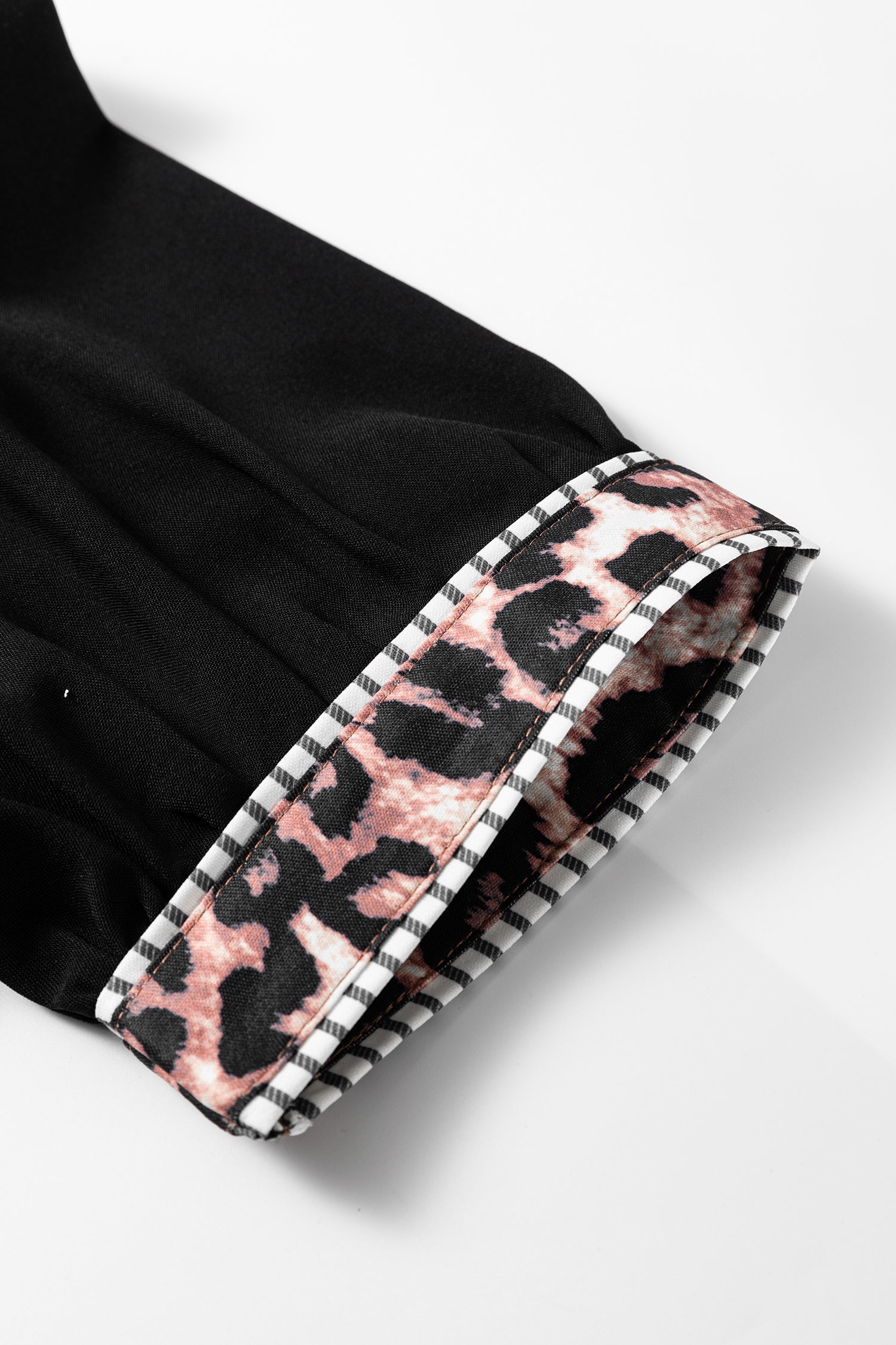 Black V Neck Short Puff Sleeve Contrast Striped Leopard Trim Button Down Shirt