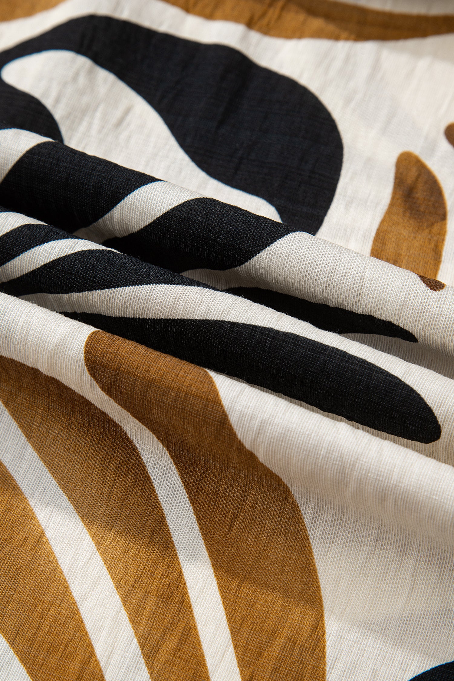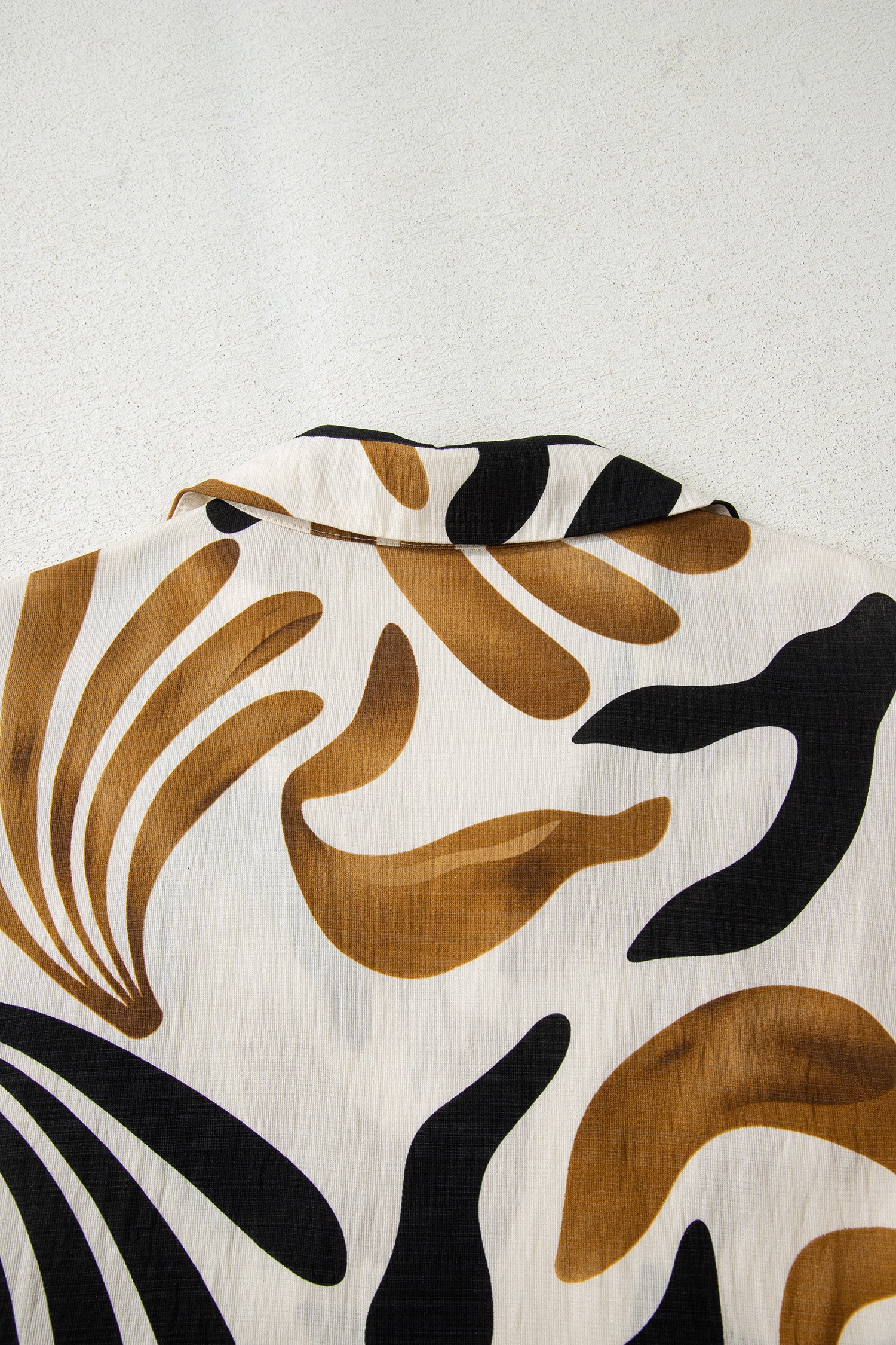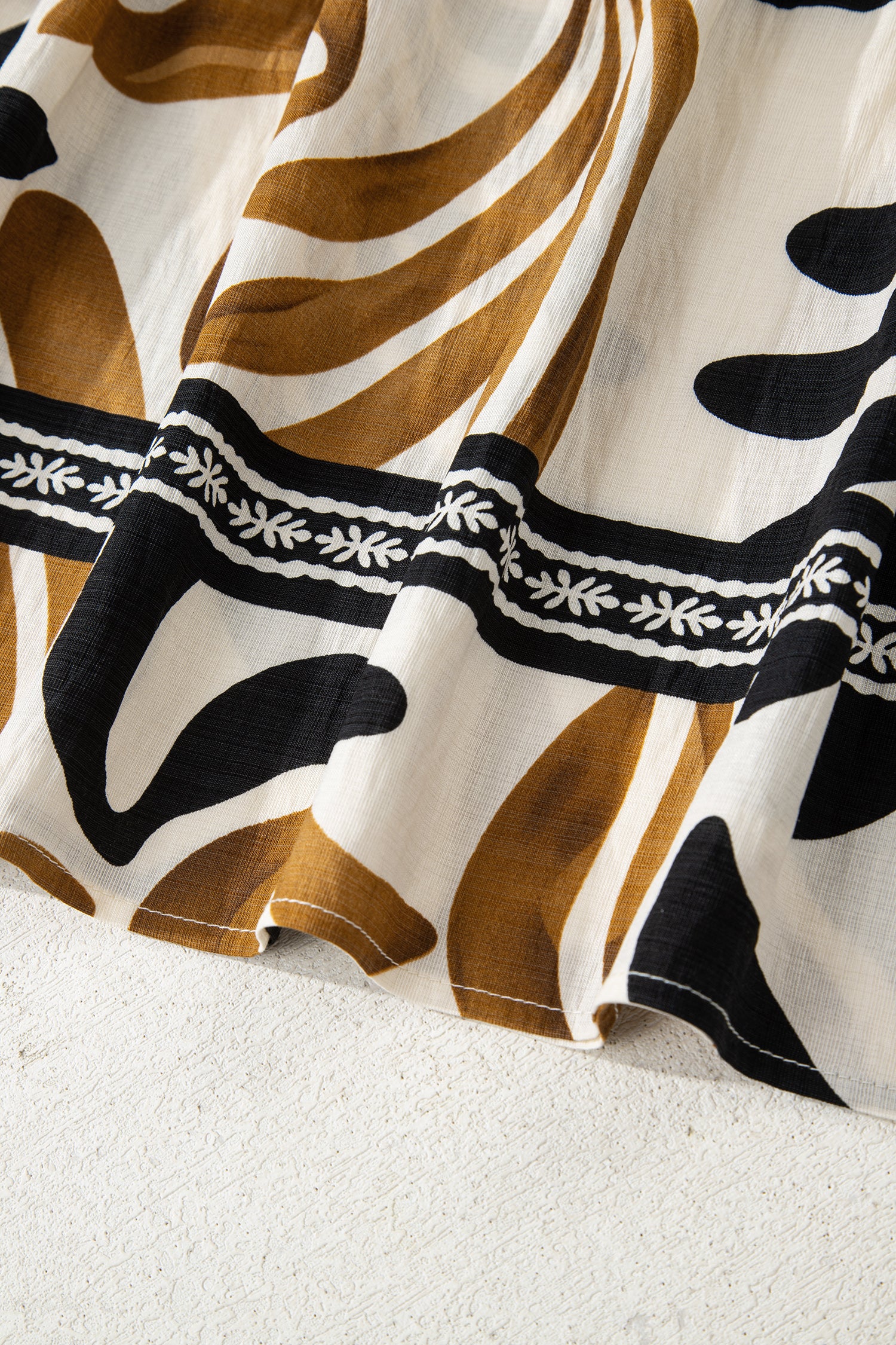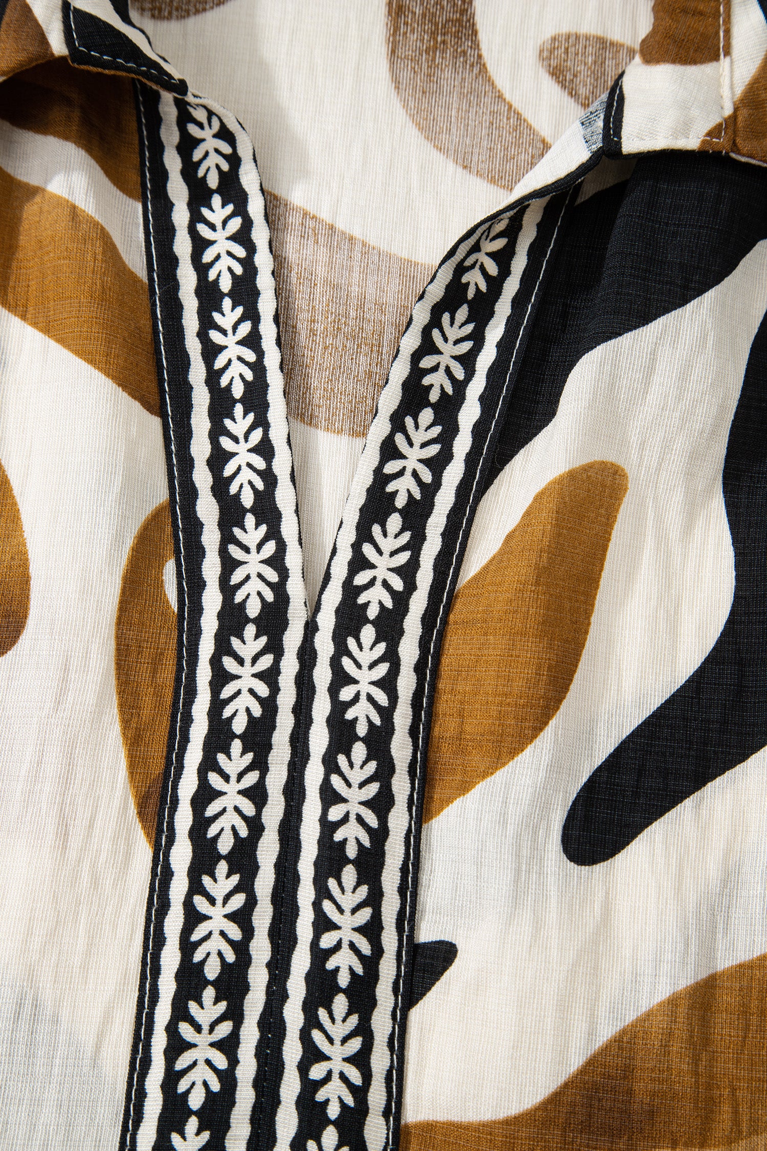 Brown Tropical Printed Contrast Trim Neck Long Sleeve Ruffle Hem Dress