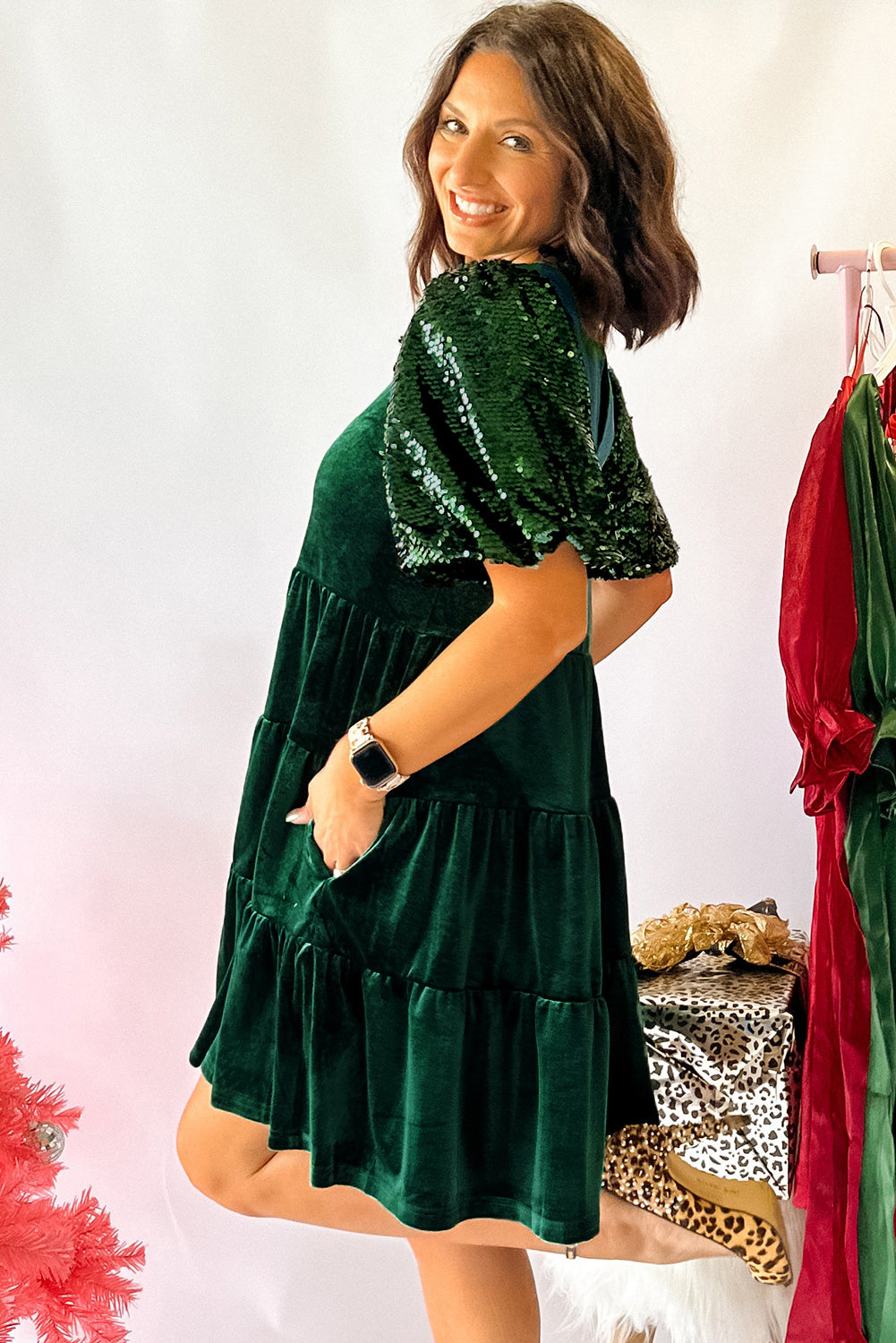 Evergreen Sequin Puff Sleeve High Waist Tiered Velvet Mini Dress
