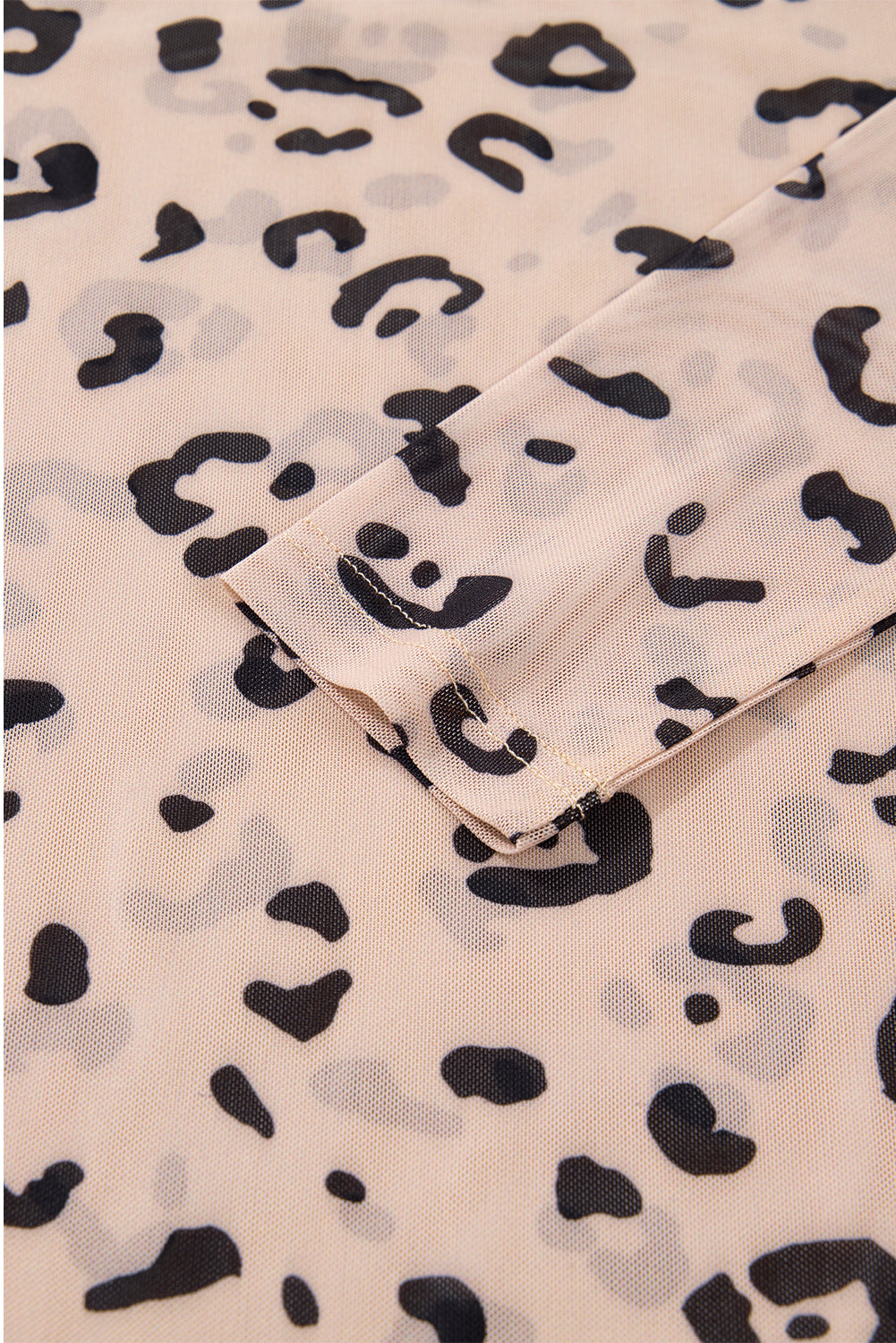 Khaki Mock Neck Sheer Mesh Leopard Long Sleeve Bodysuit