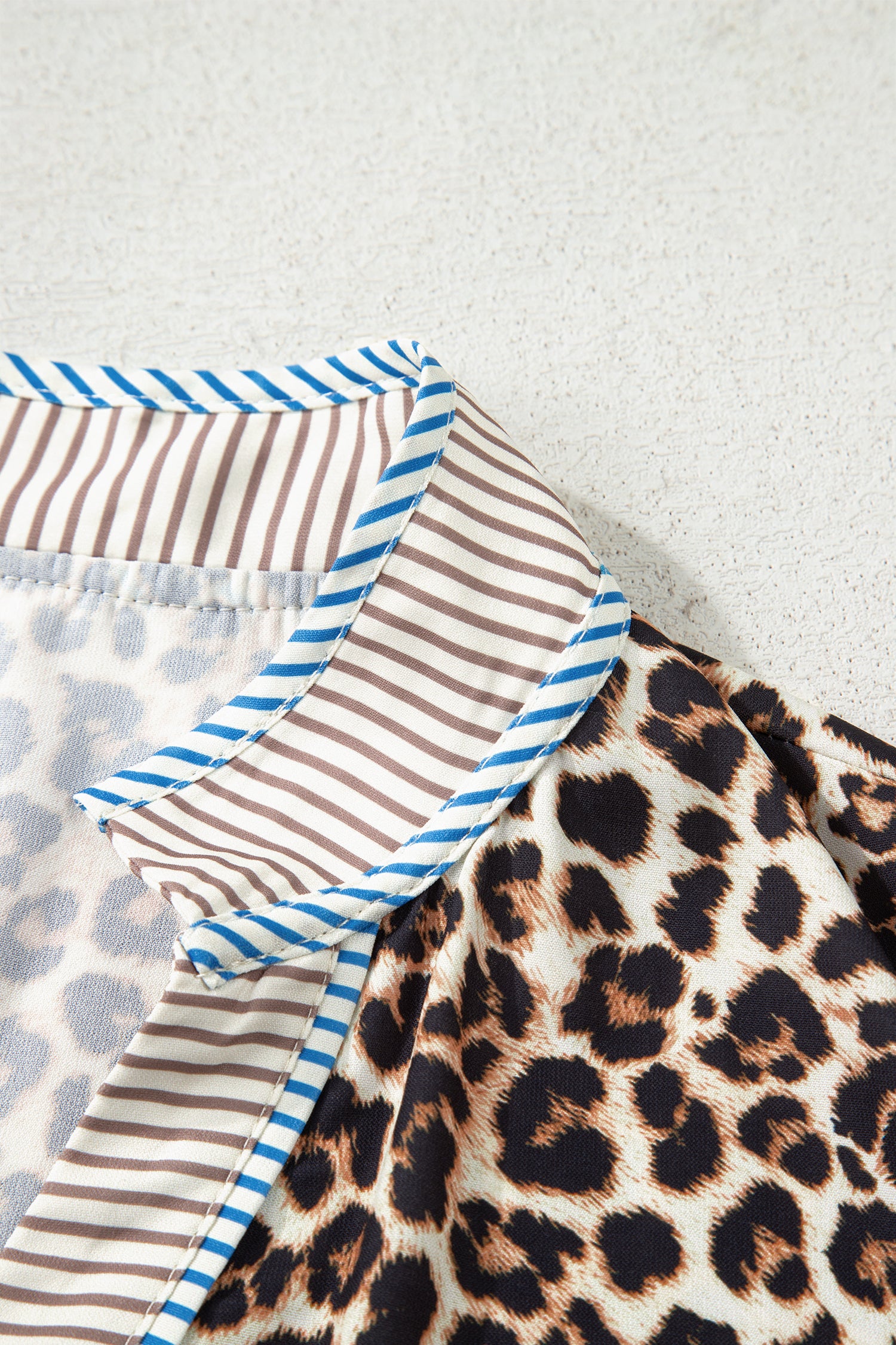 Khaki Plus Size Leopard Print Striped Trim V Neck Drop Waist Long Sleeve Mini Dress