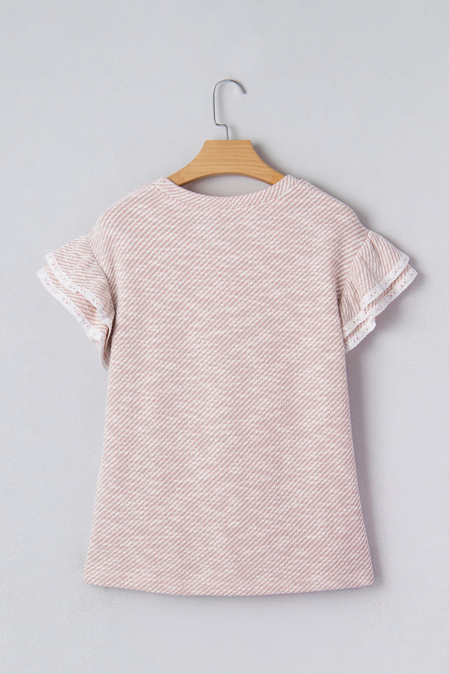 Light Pink Twilled Print Lace Trim Ruffled Short Sleeve Blouse