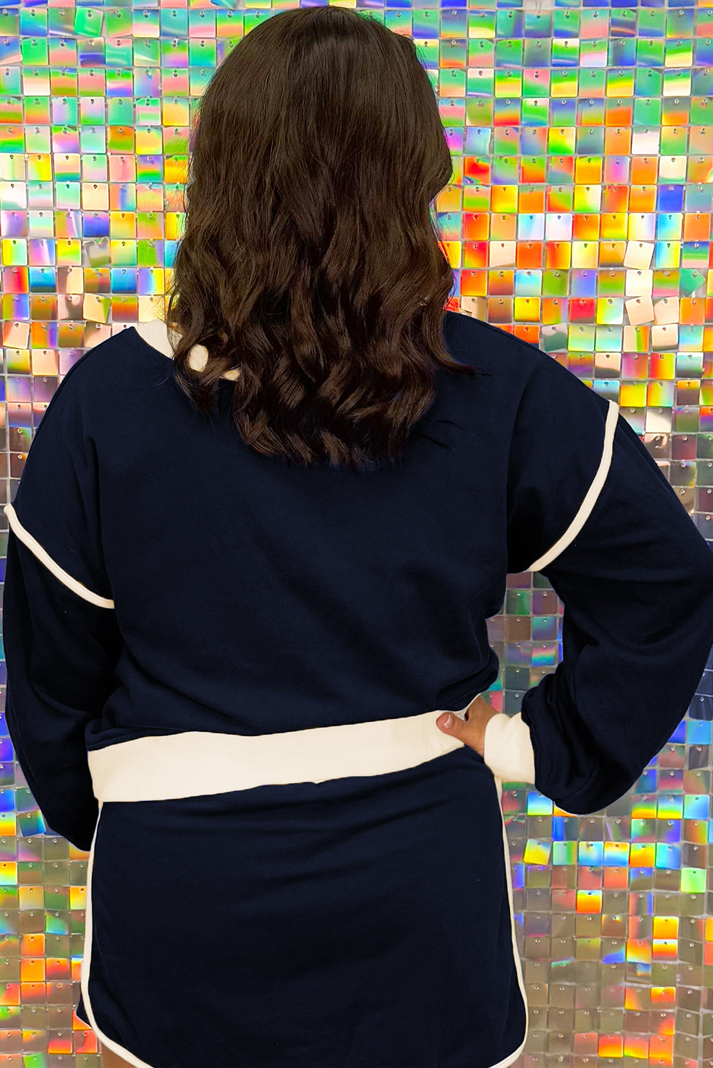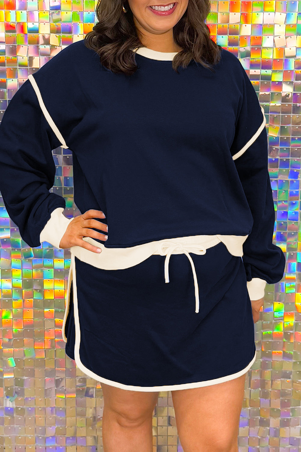 Navy Blue Plus Color Block Drop Shoulder Top and Lace-up Skirt Outfit