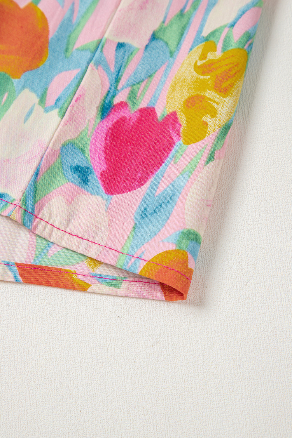 Pink Floral Layered Ruffle Flutter Sleeve Tie V Neck Blouse