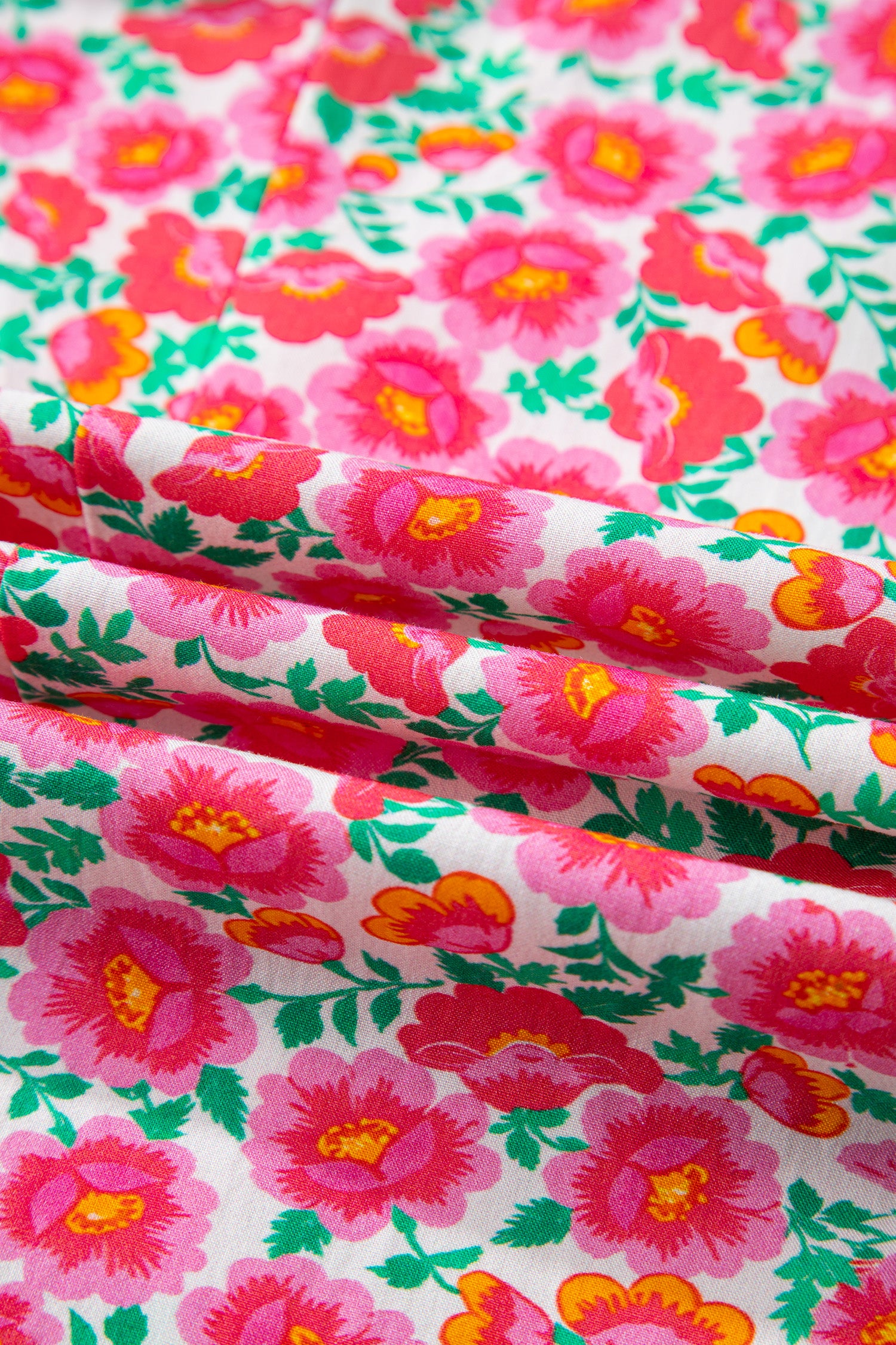 Pink Floral Print V Neck Patchwork Short Bubble Sleeve Mini Dress